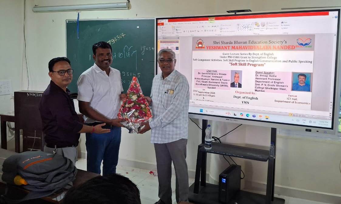 नांदेड – यशवंत महाविद्यालयाच्या इंग्रजी विभागामार्फत पी.एम. उषा योजनेंतर्गत चालविण्यात येत असलेल्या “Soft Skills in English Communication and Public Speaking” या प्रमाणपत्र अभ्यासक्रमाच्या विद्यार्थ्यांसाठी २२ सप्टेंबर २०२५ रोजी “Soft Skills” विषयावर अतिथी व्याख्यानाचे आयोजन करण्यात आले.
