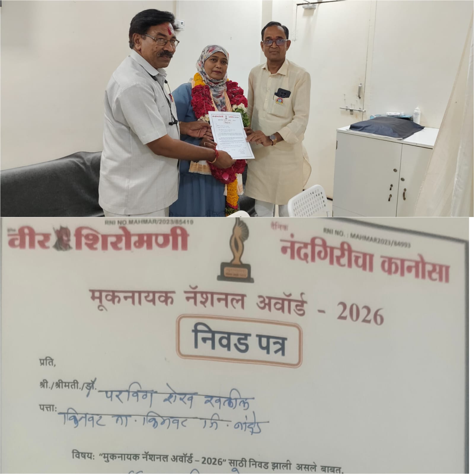 पत्रकार क्षेत्रात उल्लेखनीय कार्य करणाऱ्या परवीन शेख खलील यांची मुकनायक नॅशनल अवॉर्ड – 2026 या प्रतिष्ठित पुरस्कारासाठी निवड करण्यात आली आहे.