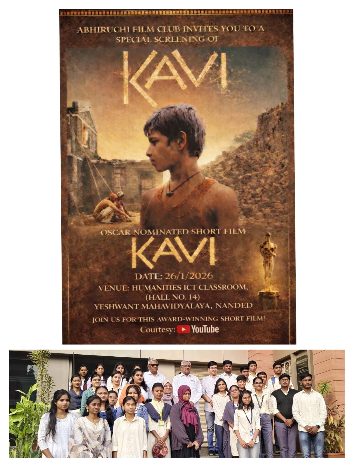 स्वातंत्र्याचा अर्थ कळतो, जेव्हा कोणाचं बालपण कैद झालेलं पाहतो,’ असा अंतर्मुख करणारा संदेश देणारा ‘कवी’ हा लघुपट पाहून विद्यार्थी भारावून गेले. निमित्त होते यशवंत महाविद्यालयातील ‘अभिरुची आस्वाद’चे.राष्ट्रीय सणांच्या दिवशी विशेष चित्रपट दाखवण्याची ‘अभिरुची फिल्म क्लब’ची ही परंपरा मागील सहा वर्षांपासून अखंडपणे सुरु आहे.त्याच परंपरेचा भाग म्हणून प्रजासत्ताक दिनाच्या दिवशी ग्रेग हेल्वी यांनी दिग्दर्शित केलेला आणि ऑस्करसाठी नामनिर्देशित झालेला ‘कवी’ हा लघुपट दाखवण्यात आला.